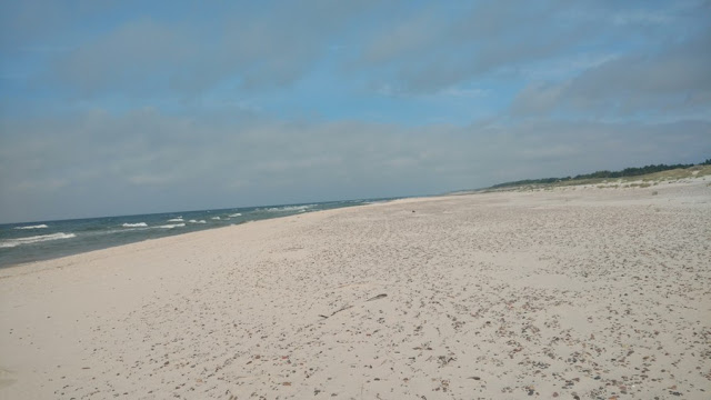 Plaża która prowadzi na wydmę jest bardzo urokliwa i jakże inna od tych które widywałam dotychczas. Szeroka, po części kamienista, z dużą ilością traw i innych roślin a na dodatek bezludna, cała wręcz dla nas. Cudna po prostu...